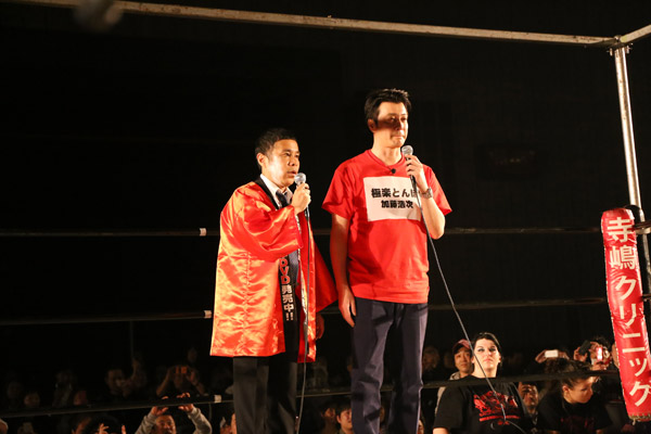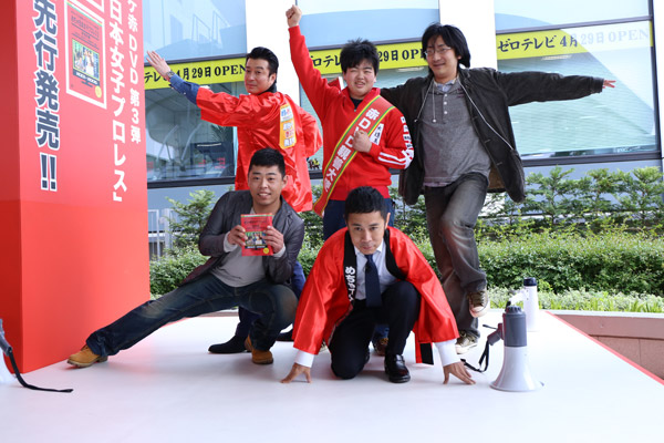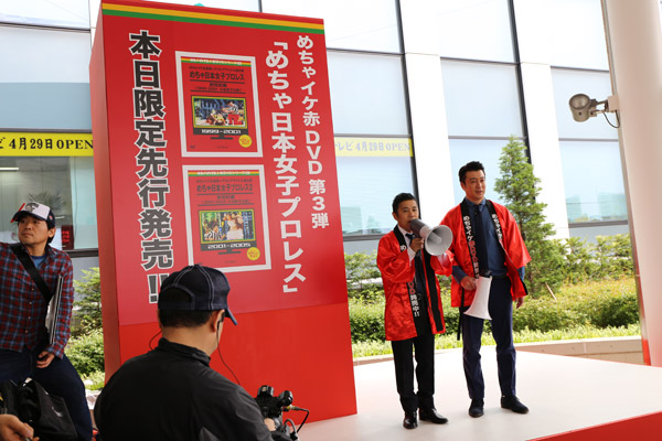 最初はしぶっていた加藤だったが、「めちゃ日本女子プロレス」DVDは“あの方”がばっちり映っていることもあり快諾。「1人でも多くの人に見てもらうためならなんでもやる!」と赤いハッピを着る。