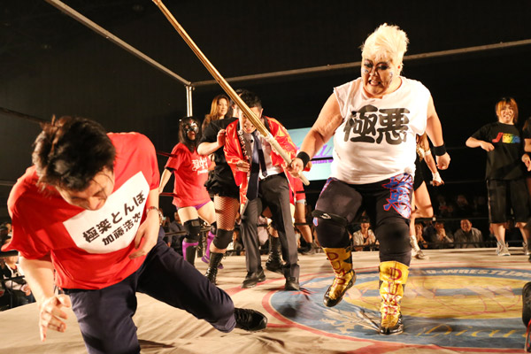 一旦外に出て、本気で入れてくるジャガー選手の文句を言っていると、窓から「なんだてめーら!」とジャガー選手が!窓越しをいいことに、加藤がチャチャを入れると、ジャガー選手は窓から飛び出し場外乱闘に!完全にビビったふたりだが、賞品として赤DVDを渡すようにアドバイスを井上京子選手からもらったため、リングへと上がることに・・・。