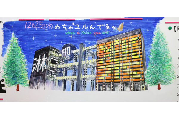 一行はお台場大江戸温泉へ向かってバスで移動。レインボーブリッジから見えた社屋には、社屋を飾るイルミネーション「グリッターエイト」が見える。めちゃユルのために特別仕様で飾られたグリッターエイトから岡村サンタにメッセージが!